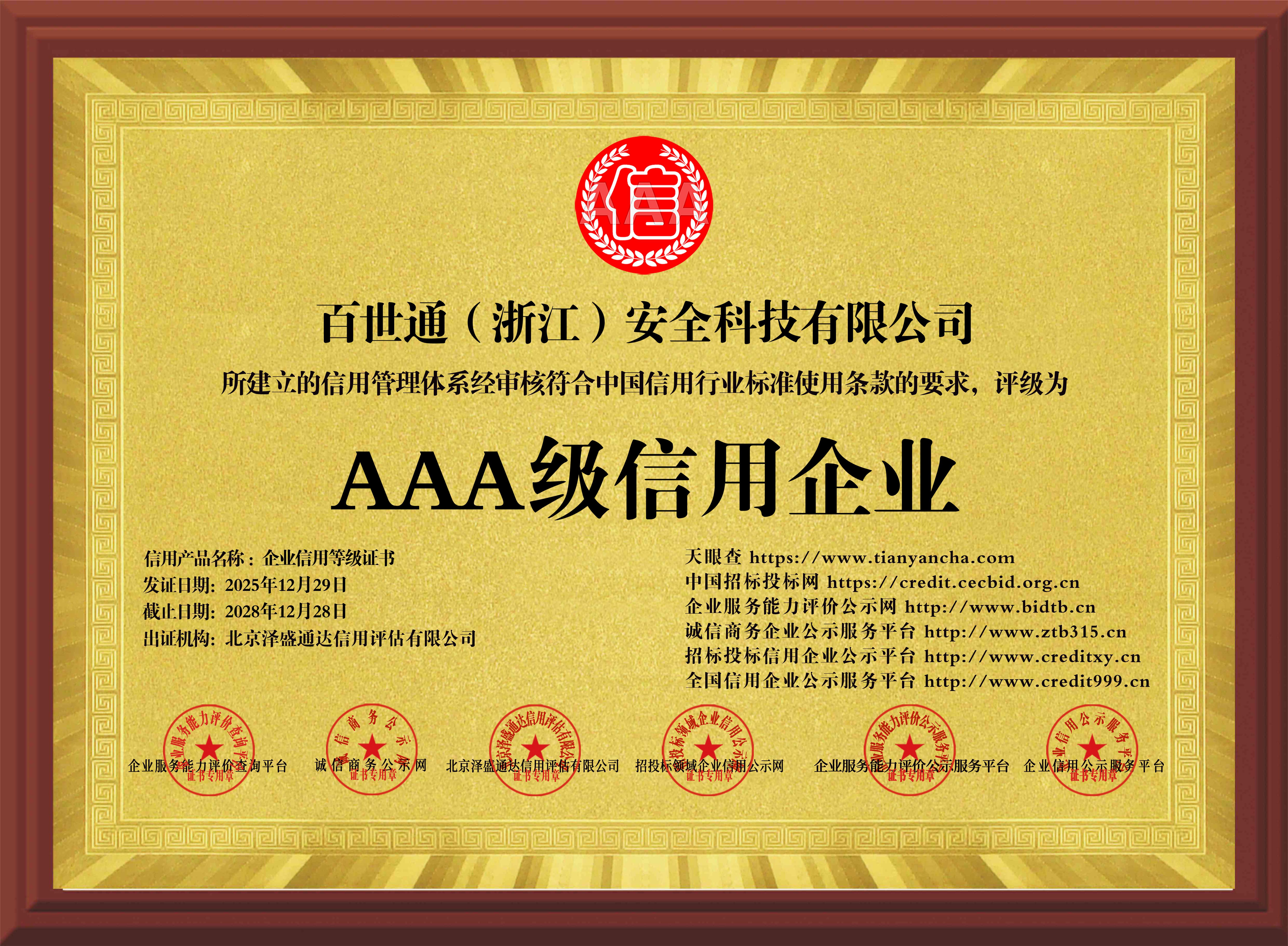 恭喜百世通(浙江)安全科技有限公司获” AAA 级信用企业“认证
